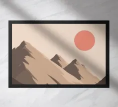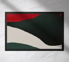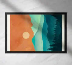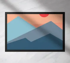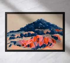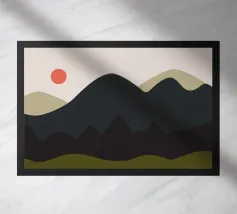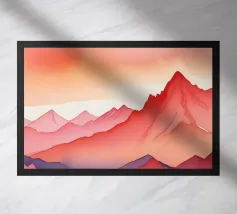 La silhouette di una catena montuosa si staglia su un cielo rosso e arancione, creando un contrasto sorprendente. I toni verdi e neri delle montagne suggeriscono una scena suggestiva al crepuscolo o all'alba.