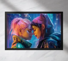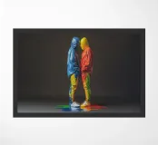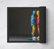 A powerful contemporary image capturing two anonymous figures facing each other in quiet confrontation. Their glossy, hooded forms are saturated with flowing pigment, colours merging and dripping downward to the floor beneath them. The symmetry of the pose contrasts with the unpredictability of the paint, creating a moment that feels intimate, tense, and emotionally charged.