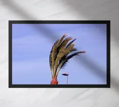 Fotografia di una palma alta e di un piccolo gabbiano su un edificio