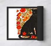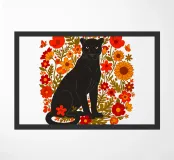 Sagoma di pantera nera circondata da fiori arancioni e rossi. Tavolozza calda, motivo floreale caratteristico; ideale per progetti audaci, tessuti grafici e accessori.