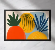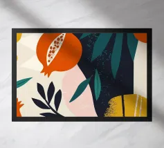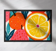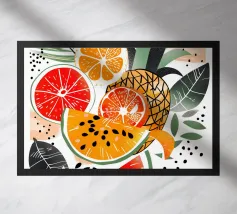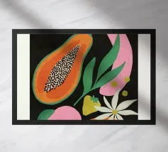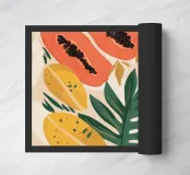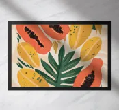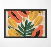 Un'illustrazione vivace e stilizzata di papaya a fette con foglie verde scuro su uno sfondo chiaro. Il motivo ripetitivo e il colore arancione brillante creano un'atmosfera fresca e tropicale.