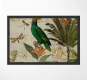 Un vivace collage di illustrazioni vintage con bellissimi e colorati pappagalli verdi appollaiati in mezzo a un lussureggiante paesaggio floreale. La scena รจ ricca di fascino tropicale ed esotico, poichรฉ i pappagalli si stagliano sullo sfondo del fogliame vibrante della giungla. Intorno a loro sbocciano incredibili fiori esotici, mentre i rami di palma aggiungono un tocco di eleganza tropicale. Sullo sfondo, una mappa d'epoca emerge dolcemente, aggiungendo un senso di avventura e di viaggio. Questa miscela armoniosa di natura, fauna selvatica e fascino vintage crea un disegno senza tempo, perfetto per gli amanti dei paesaggi esotici e dell'arte nostalgica.