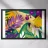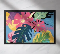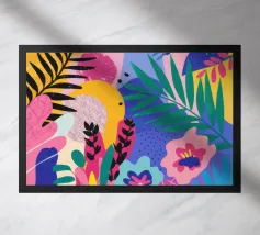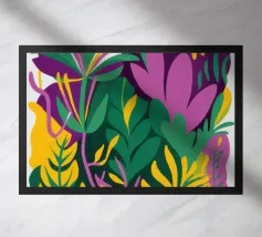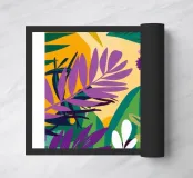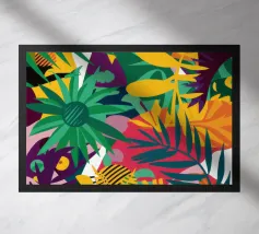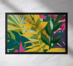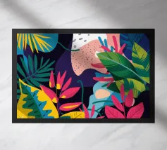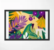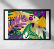 Una lussureggiante scena di giungla incornicia un grappolo d'uva viola, creando una natura morta unica e inaspettata che fonde il fogliame tropicale con la frutta del frutteto in una composizione vibrante.