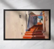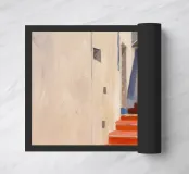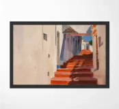 Uno stretto passaggio illuminato dal sole tra edifici bianchi è caratterizzato da una serie di scale rosso cremisi che creano una composizione audace, grafica e architettonicamente interessante, ricca di fascino mediterraneo.