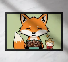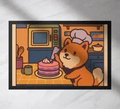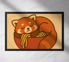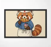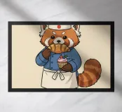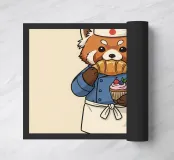 Un panda rosso vestito da pasticcere tiene in mano un vassoio di dolci, con una scritta in giapponese che aggiunge un tocco di autentico fascino da pasticceria.