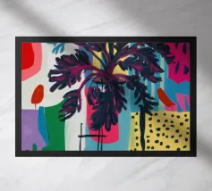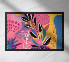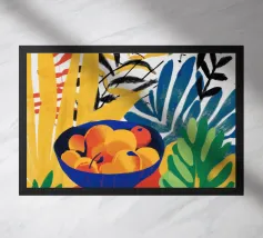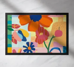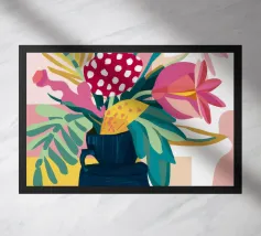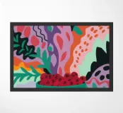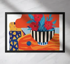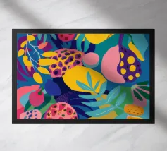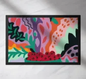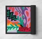 Una composizione astratta presenta una ciotola di fragole in mezzo a un turbinio di forme e motivi organici e colorati, creando un'interpretazione fresca e moderna di un classico dell'estate.