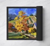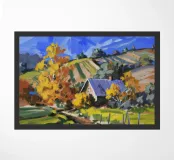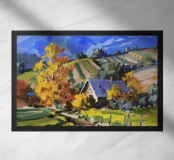 Un pittoresco paesaggio autunnale che raffigura un villaggio o una fattoria adagiata su una collina, circondata da un mosaico di alberi colorati nei toni dell'arancione e del giallo e da campi coltivati, con le lontane montagne blu a completare la scena.