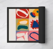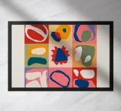 Una composizione astratta moderna e giocosa, caratterizzata da una disposizione a griglia di forme organiche e colorate. L'opera si presenta come un puzzle sofisticato ed equilibrato di forme e colori.