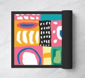 Una vibrante composizione astratta che ricorda una trapunta patchwork, con vari blocchi di colore, motivi geometrici e texture che creano un disegno vivace e tattile.