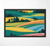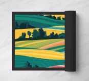 Un dipinto paesaggistico espressivo e vibrante di campi ondulati, simili a patchwork, nei toni del verde, del giallo e del rosa. Lo stile pittorico cattura la bellezza dinamica e la consistenza della campagna.