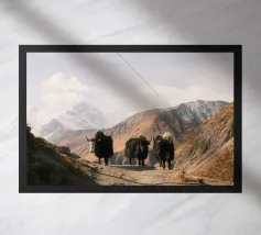 Un viaggiatore solitario si aggira lungo una tortuosa strada sterrata, incorniciata da imponenti cime montuose e da un cielo azzurro infinito. Questa stampa accattivante cattura l'essenza dell'avventura, della solitudine e della cruda bellezza della natura, perfetta per chi sogna paesaggi immensi e natura selvaggia.
