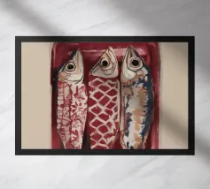 Composizione decorativa di tre pesci decorati.