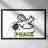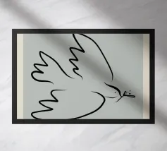 A dove outlined in black holds a small, stylized Earth in its beak, symbolizing global peace. The word "PEACE" is written in bold yellow letters below the dove.