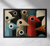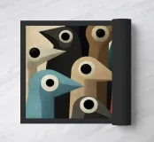 Arte astratta di uccelli con forme geometriche e colori tenui.