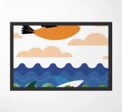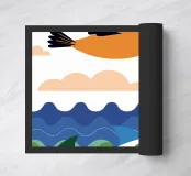 Godetevi una vivace illustrazione dell'oceano con un pellicano che vola sopra uno squalo che nuota nel mare.