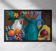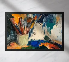 Un vivace barattolo di pennelli si trova alla luce del sole su un tavolo da studio, traboccante di potenziale artistico.