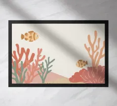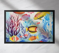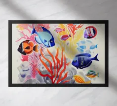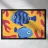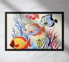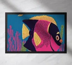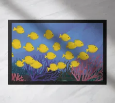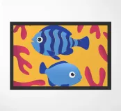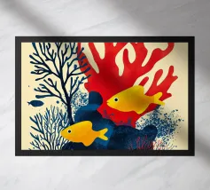 Questo dipinto mostra due pesci che nuotano nell'acqua, circondati da forme colorate simili a coralli. Lo sfondo è un vivace mix di giallo e rosa.