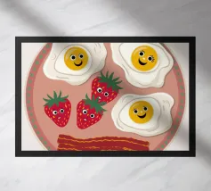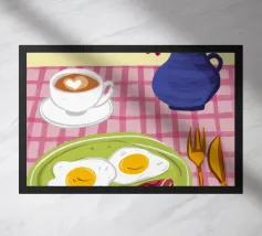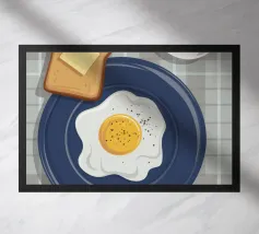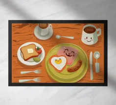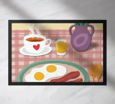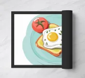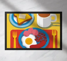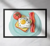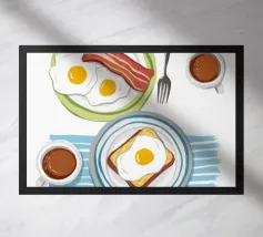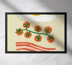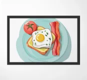 Un'illustrazione semplice e appetitosa di un classico piatto da colazione con un uovo perfettamente fritto, bacon croccante e una fetta di pomodoro su pane tostato.