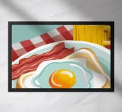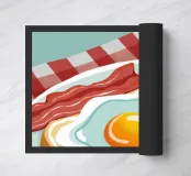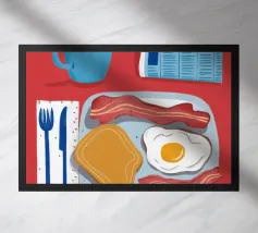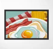 Un classico piatto da colazione con un uovo al sole su pane tostato, bacon e una tazza di caffè. L'illustrazione ha un fascino confortante e appetitoso.