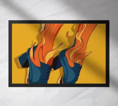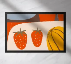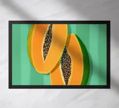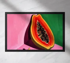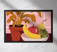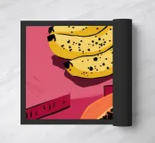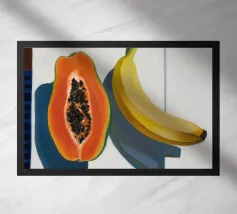 Un'illustrazione audace e ispirata alla pop art di banane e papaya su un piatto rosso brillante. I colori ad alto contrasto e lo stile grafico creano una dichiarazione vibrante e giocosa.