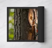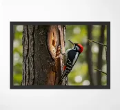 Un picchio si arrampica su un albero, beccando la corteccia alla ricerca di insetti. La luce del sole filtra attraverso la foresta, illuminando la vivace scena.