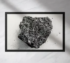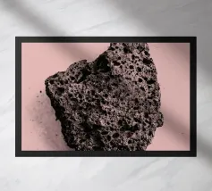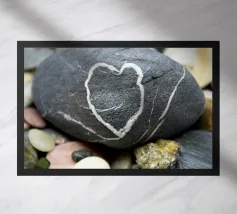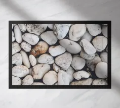 Rocce di varie forme e dimensioni sono adagiate su una spiaggia, con un'attenzione particolare a una pietra unica e strutturata. L'ambiente appare tranquillo, con la luce del crepuscolo che mette in risalto il paesaggio naturale.