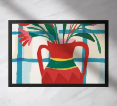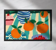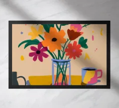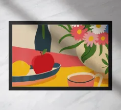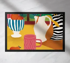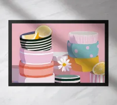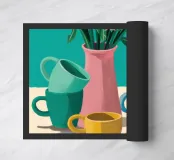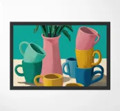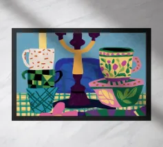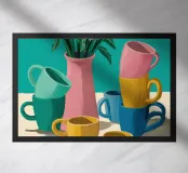 Questa natura morta è incentrata su un'allegra pila di tazze colorate nei toni del verde acqua, del giallo e del rosa. La composizione semplice e lo stile grafico e pulito celebrano la bellezza degli oggetti quotidiani, creando un pezzo moderno e confortante al tempo stesso, perfetto per uno spazio cucina.