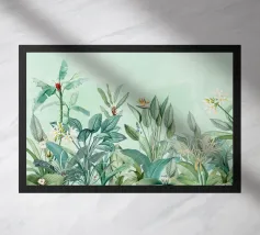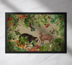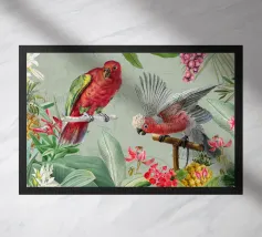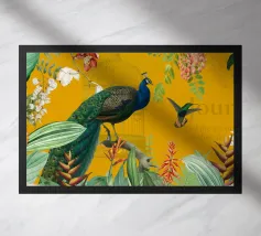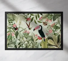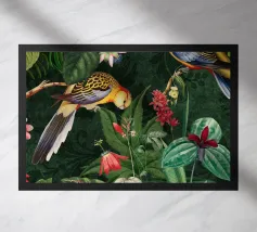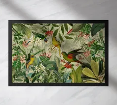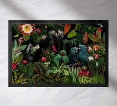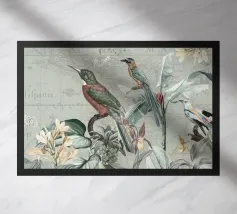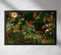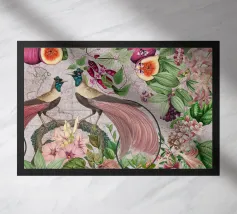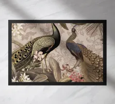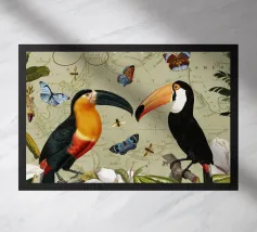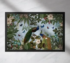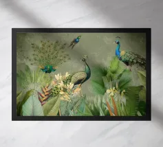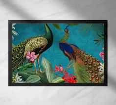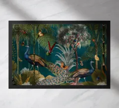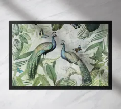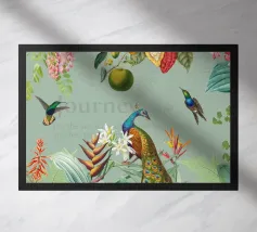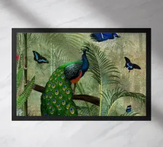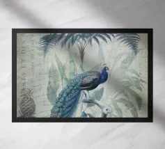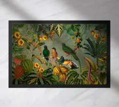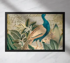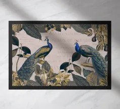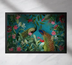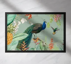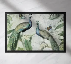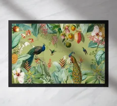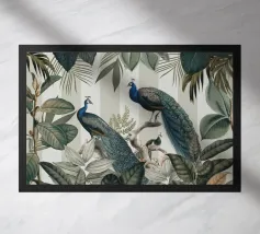Questo collage vintage cattura l'eleganza dei tropici con una splendida composizione di lussureggianti foglie tropicali e frutti vivaci. Al centro, due splendidi pavoni si ergono con grazia, con le loro piume iridescenti che brillano nei toni del blu, del verde e dell'oro. Il maestoso piumaggio dei pavoni contrasta con il ricco fogliame, aggiungendo un senso di raffinata bellezza. Le sottili texture vintage dello sfondo esaltano l'eleganza generale, mentre i colori vibranti delle foglie e dei frutti danno vita alla scena, evocando un paradiso esotico senza tempo.