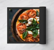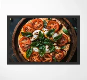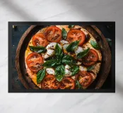 pizza pomodori basilico mozzarella formaggio piatto di legno erbe aromatiche pomodori ciliegini olio d'oliva pepe sale sfondo scuro presentazione del cibo guarnire stile rustico ingredienti freschi balsamico verdure a foglia pomodoro a fette guarnizione di formaggio