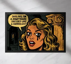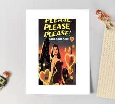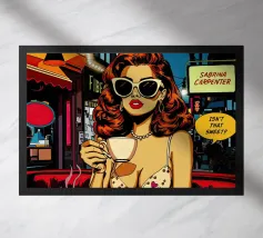 Per favore, per favore, per favore, arte pop "Please Please Please" di Sabrina Carpenter - che cattura l'energia ad alto tasso di dramma e lucentezza dell'amare qualcuno con un talento per il caos. Disegnata in un audace stile da fumetto retrò, quest'opera d'arte presenta un'eroina glamour, che si muove tra bandiere rosse e rossetto rosso. Sia che stiate cavalcando l'onda di una storia d'amore incasinata o che stiate semplicemente vibrando al ritmo del vostro inno pop preferito, questa stampa porta la grande energia del "posso sistemarlo (ma non dovrei farlo)" in ogni spazio.