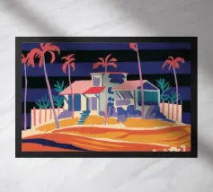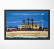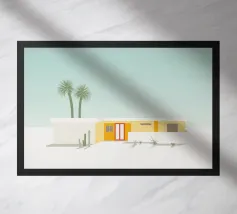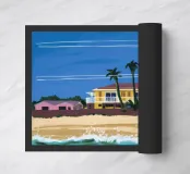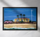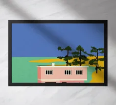 Una casa da spiaggia gialla con veranda si trova dietro le dune in un pomeriggio di sole, evocando la sensazione rilassata e sbiadita del sole di una vacanza sulla costa.
