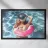 L'immagine cattura una scena giocosa e surreale durante una festa in piscina. Una donna nuota nell'acqua cristallina indossando un casco con una palla da discoteca scintillante che riflette la luce del sole. È sdraiata su un anello gonfiabile rosa e tiene in mano un bicchiere con una bevanda colorata di rosa, che contribuisce a creare un'atmosfera festosa. Il suo costume da bagno è scintillante e si adatta all'atmosfera glamour e divertente della scena. L'acqua intorno a lei luccica e i motivi luminosi danzano sulla sua superficie, contribuendo all'atmosfera vivace e spensierata dell'immagine.