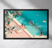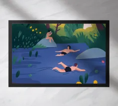 Sotto i rami carichi di frutta e un cielo di un azzurro infinito, l'estate si riversa dolcemente nelle risate e nella luce del sole. L'acqua brilla come un ricordo, morbida e scintillante, mentre conversazioni tranquille e corpi alla deriva scandiscono il ritmo di un pomeriggio senza fretta. Qui tutto sembra impregnato di sole e sospeso, come se la giornata potesse durare all'infinito.