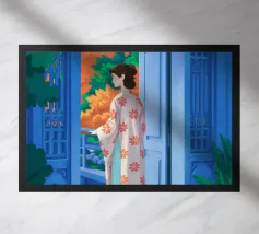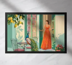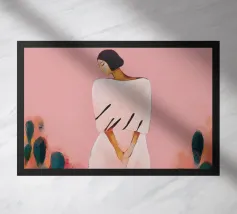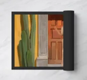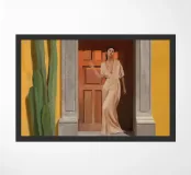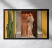 Immersa nel bagliore ambrato della luce pomeridiana, una donna si appoggia con tranquilla eleganza a una porta scolpita nella pietra. Il suo abito fluente fa eco alle morbide pieghe dell'ombra intorno a lei, mentre le pareti gialle e i cactus torreggianti fanno da cornice a una scena intrisa di calore e calma mediterranea. È un momento di pausa e di movimento, dove sole e solitudine si incontrano.