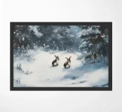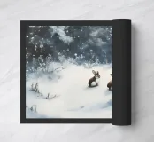Idilliaco poster invernale con due conigli seduti in una foresta innevata. I fiocchi di neve che cadono dolcemente e i maestosi abeti creano un'atmosfera tranquilla e fiabesca. Questo murale combina motivi animali e natura invernale ed è perfetto per decorare il soggiorno, la camera da letto o la stanza dei bambini. Un'opera d'arte che porta la pace, l'intimità e la magia dell'inverno in ogni casa, ideale per gli amanti degli animali e della natura.