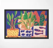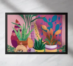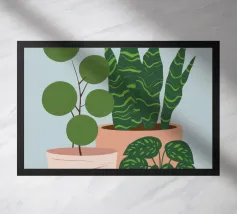 Su uno sfondo chiaro è raffigurata una serie di piante d'appartamento in vasi colorati e a fantasia. Le piante variano per dimensioni e forma delle foglie, creando un'affascinante scena di giardino interno.