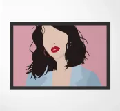 Una donna senza volto con rossetto rosso e capelli neri sciolti posa con sicurezza su un rosa tenue.