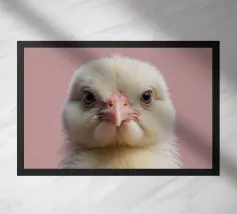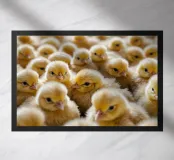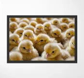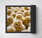 Un vivace gruppo di pulcini gialli riempie lo spazio, mettendo in mostra le loro morbide piume e le loro espressioni curiose. La luce calda esalta l'atmosfera accogliente della fattoria.