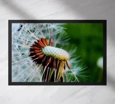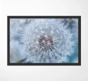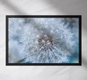 Dente di leone bianco su sfondo blu, ripresa macro.