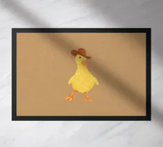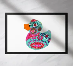 Un'illustrazione altamente dettagliata e realistica di un'anatra di gomma gialla brillante seduta su un morbido sfondo blu. La finitura lucida e i colori vivaci evidenziano il suo carattere allegro e giocoso.