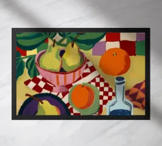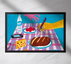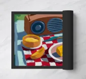 Una nostalgica natura morta con una radio in stile vintage, un piatto di pane e formaggio su un panno di percalle, una tazza di caffè e una bottiglia di vino. La scena evoca un'atmosfera accogliente e retrò, perfetta per una cucina o una sala da pranzo.