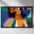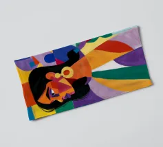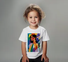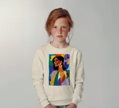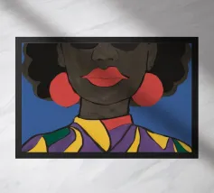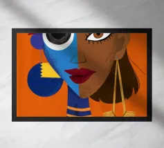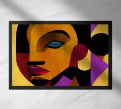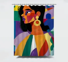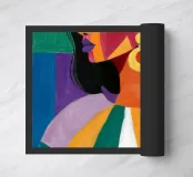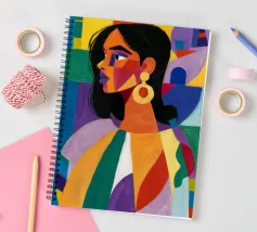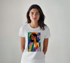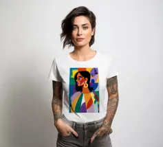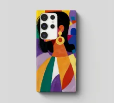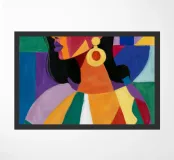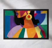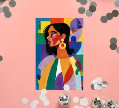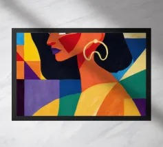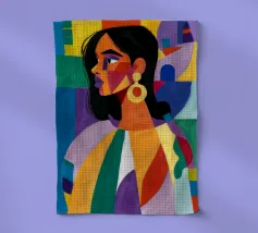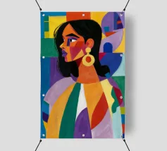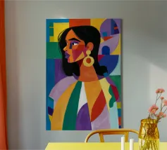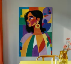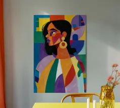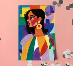 Un ritratto sorprendente di una donna con i capelli scuri, ornata da un orecchino giallo, raffigurata in uno stile vibrante, con blocchi di colore che utilizzano forme audaci di verde, arancione, blu e giallo, che trasudano sicurezza ed eleganza moderna.