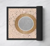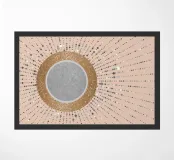 Splendido paesaggio astratto dall'effetto metallico, con un sole brillante in argento e oro con raggi solari disegnati con punti grigi e bianchi e colline scintillanti in marrone, su uno sfondo beige.