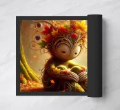A charming Twiglet, a wooden-like creature full of personality, rests peacefully under a grand, ancient tree in the heart of an enchanting forest. With its smooth, natural wood texture and whimsical carved details, the Twiglet blends seamlessly with its lush surroundings. Sunbeams dance through the leafy canopy above, casting a warm glow that highlights the creature's playful and serene demeanor. The forest floor is alive with soft moss, scattered leaves, and earthy tones, creating a cozy, magical setting that captures the essence of nature’s whimsy