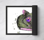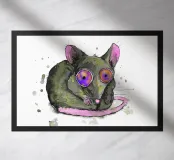 A spotty watercolor drawing of a black rat. Grunge dripping style. He has big purple eyes. He looks at you in bewilderment.