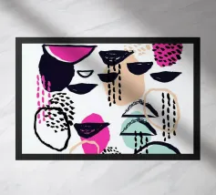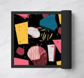 Un motivo dinamico e divertente di forme astratte colorate e di ispirazione retrò è sparso come coriandoli su uno sfondo nero, creando un disegno vibrante ed energico dal sapore vintage.