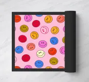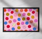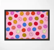 Diffondete l'allegria con questo vivace disegno senza cuciture di faccine sorridenti. Il disegno divertente e giocoso presenta una serie di faccine sorridenti in un mix di colori brillanti e neon su uno sfondo rosa tenue. Questo motivo ripetuto di ispirazione retrò è perfetto per aggiungere un tocco di allegria a qualsiasi progetto. Da showmemars