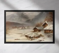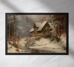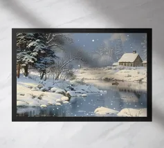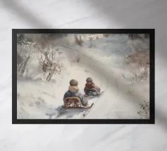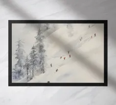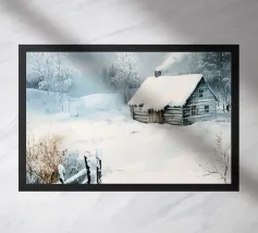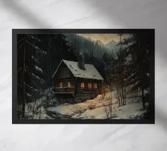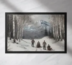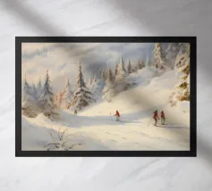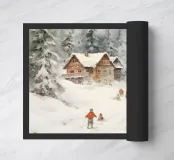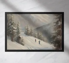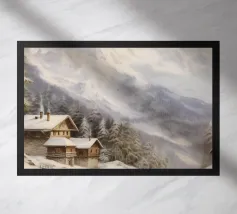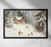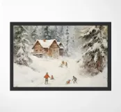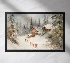 Questa suggestiva immagine invernale mostra una baita innevata circondata da maestosi abeti e cime impervie. Davanti alla baita, sciatori e bambini scivolano felici sulla neve, conferendo alla scena un'atmosfera vivace ma tranquilla. I colori tenui del cielo in contrasto con il bianco del paesaggio creano un motivo invernale armonioso e romantico, ideale per chi ama la magia della montagna. Perfetto per murales, poster, tazze, cover per cellulari, cuscini, tende da doccia e T-shirt.