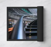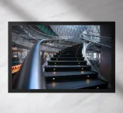 Le ringhiere metalliche tracciano la curva con fluida precisione, con un design robusto e raffinato, magari ornato da motivi ornamentali o mantenuto minimale e moderno. Freddo al tatto, il metallo brilla sottilmente, catturando la luce a ogni curva. Ogni gradino invita a salire, creando un senso di tranquilla attesa, come se la scala non conducesse semplicemente a un altro piano, ma a una storia che si svolge al di sopra.