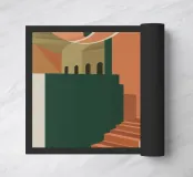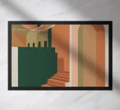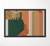 Un'opera architettonica minimalista che mostra una scala curva nei toni caldi della terracotta e del rosa su una parete beige. Un arco verde scuro e una pianta stilizzata aggiungono profondità e un tocco di natura alla composizione serena.